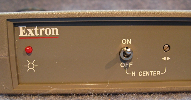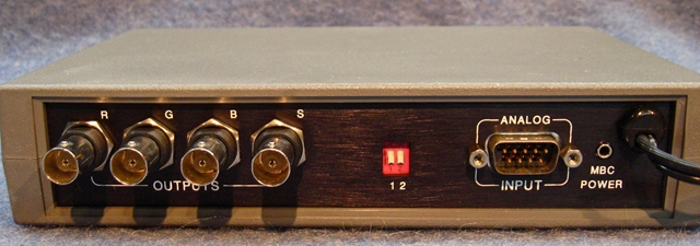 The unit has a 9 pin male input connector, with 4 BNC jacks on the rear panel.  There is a Horizontal centering control on the front panel with a defeat switch.