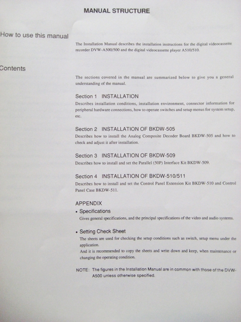 - Sony DVW-A500/500 DVW-A510/510 Installation Manual 1st Edition